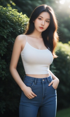 ,Textured skin, big breasts,Peach rumpplump,dim light, low key,A young woman with dark hair, wearing a Black sling and blue jeans, stands outdoors with a backdrop of greenery, She has a confident expression and is looking directly at the camera,,, <lora:WDR_景深-通透调节器:1>(EOS R8,50mm,F1.2,8K,RAW photo,reality_ray_tracing,sidelight,lens flare,