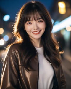 Textured skin, dim light, low key,1girl, solo,long hair, bow, looking at viewer,grin,, jacket,,, black hair, lens_flare,, brown hair, upper body, bangs, mole,18 yesr old,,, <lora:WDR_景深-通透调节器:1>(EOS R8,50mm,F1.2,8K,RAW photo,reality_ray_tracing,sidelight,