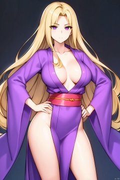 1girl, solo, long hair, breasts, looking at viewer, bangs, blonde hair, large breasts, long sleeves, cleavage, very long hair, closed mouth, standing, purple eyes, collarbone, thighs, cowboy shot, japanese clothes, wide sleeves, kimono, parted bangs, sash, no bra, obi, side slit, hands on hips, ((poakl))