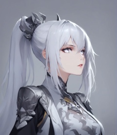 solo, highly detailed, cinematic highlight hair, (best quality), ((masterpiece)),1girl, white hair,simple_background, long hair,miaoying,ponytail,white eyes,looking_at_viewer,