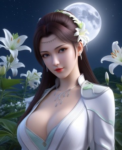 <lora:576-DA-XL-斗破苍穹-云韵-白服:0.8>(,1girl, ,best quality, ),looking at viewer,  ,ultra detailed background,ultra detailed background,ultra realistic 8k cg, , ,masterpiece, (( , )),, ultra realistic 8k cg, ,      ,lily \(flower\) ,full moon ,strawberry blossoms      (cleavage), (),