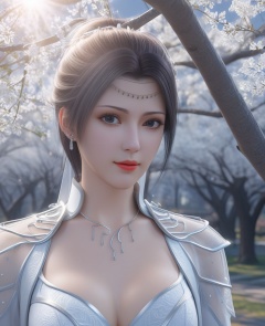 <lora:576-DA-XL-斗破苍穹-云韵-白服:0.8>(,1girl, ,best quality, ),looking at viewer,  ,, ultra detailed background,ultra detailed background,ultra realistic 8k cg,,masterpiece, (( , )), fiction,mole,  ,     ,see-through, lace, (cleavage),(((, solo, sun, , bare_tree, )))