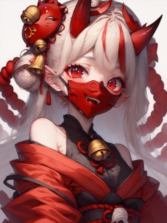score_9, score_8_up, score_7_up, score_6_up,1girl, solo, bell, hair bell, virtual youtuber, nakiri ayame, long hair, horns, red eyes, hair ornament, double bun, hair bun, smile, mask, white hair, oni horns, oni mask, upper body, multicolored hair, blush, white background, open mouth, jingle bell, japanese clothes, mask on head, red hair, bare shoulders, kimono, simple background, streaked hair, holding, off shoulder, bangs, :d, tassel, oni, breasts, fang <lora:Asekkk pony re a:1>