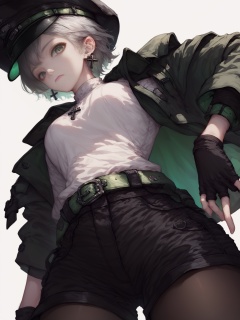 score_9, score_8_up, score_7_up, score_6_up, 1girl, solo, green eyes, white background, hat, shorts, earrings, looking at viewer, simple background, jewelry, short hair, holding, black headwear, pantyhose, black shorts, shirt, grey hair, white shirt, closed mouth, long sleeves, jacket, belt, gloves, from below, breasts, black gloves, cross earrings, fingerless gloves, short shorts, black pantyhose, peaked cap<lora:Asekkk pony re a:1>