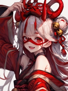 score_9, score_8_up, score_7_up,1girl, solo, bell, hair bell, virtual youtuber, nakiri ayame, long hair, horns, red eyes, hair ornament, double bun, hair bun, smile, mask, white hair, oni horns, oni mask, upper body, multicolored hair, blush, white background, open mouth, jingle bell, japanese clothes, mask on head, red hair, bare shoulders, kimono, simple background, streaked hair, holding, off shoulder, bangs, :d, tassel, oni, breasts, fang <lora:Asekkk pony re-000008a:1>,
