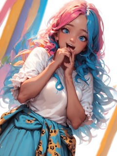 score_9, score_8_up, score_7_up, score_6_up, score_5_up, score_4_up,  <lora:Asekka pony:1>,rating_questionable, extremely detailed, (high quality, detailed, beautiful), source_anime, detailed beautiful eyes, official art, BREAK, chonxx, 1girl, dark skin, blonde hair, blue hair, pink hair, split dyed hair, blue eyes, leopard print, skirt, frilled skirt,  looking down , laugh, hand on mouth, happy, open mouth, sweater around waist, dutch angle, white background,