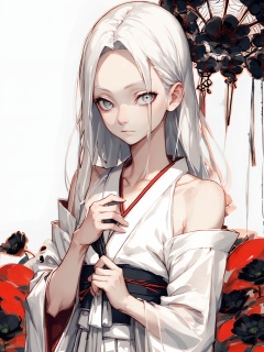 score_9, score_8_up, score_7_up, score_6_up, score_5_up, score_4_up, <lora:Asekka pony:1>,1girl, holding Garlic flower, solo, white theme, holding, white hair, skull, looking at viewer, grey eyes, long hair, white eyes, bangs, closed mouth, blunt bangs, japanese clothes, long sleeves, white kimono, kimono, grey background, wide sleeves, straight hair, upper body, white hakama, covered collarbone, pale skin, red circle, jinbai, spider web, flat chest, hakama, off shoulder, ribbon, expressionless, hair over shoulder, white background, red ribbon, parted bangs, straight-on, albino, bare shoulders, silk, hand up, dutch angle, sidelocks, camellia, flower, holding flower, see-through, ribbon-trimmed sleeves, half-closed eyes, miko, bug, black flower, no mouth, multicolored eyes, spider, hand on own chest, forehead, ribbon trim, hair over one eye,