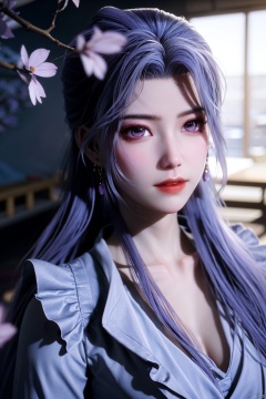 best quality,masterpiece,X-Yunxiao,1girl,solo,long hair,looking at viewer,jewelry,closed mouth,purple eyes,upper body,purple hair,earrings,blurry,blurry background,sunlight,red lips,(big breasts:1.39),X-Yunxiao,X-Hydrangea