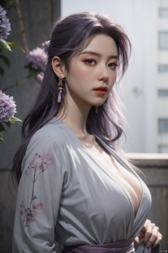 best quality,masterpiece,X-Yunxiao,1girl,solo,long hair,looking at viewer,jewelry,closed mouth,purple eyes,upper body,purple hair,earrings,blurry,blurry background,sunlight,red lips,(big breasts:1.39),X-Yunxiao,X-Hydrangea, traditional chinese ink painting