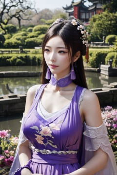best quality,masterpiece,a girl,mouth gauze,purple eyes, X-ziling,(big breasts),,(Ancient Chinese architecture, Suzhou gardens, gardens full of flowers:1.3),