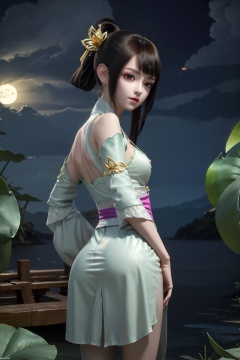standing,dress,chinese clothes,flower,full_moon,moon,night,lily_pad,lotus,moonlight,nipples,water,night_sky,lily_\(flower\),sky,partially_submerged,1girl,solo,hair ornament,long hair,realistic,nail polish,photo_\(medium\),(small breasts,cleavage),makeup,(8k, RAW photo, best quality, masterpiece:1.2),(realistic, photorealistic:1.3),ultra-detailed,extremely detailed cg 8k wallpaper,(crystalstexture skin:1.2),extremely delicate and beautiful,(sexy pose:1.2),ass,from behind,(looking back:1.5),bent over,hair ornament