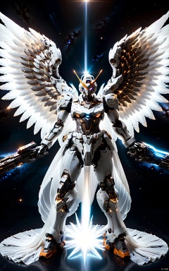 4K,Official art, unit 8 k wallpaper, beautiful and aesthetic, masterpiece, best quality, full body Still life photography, long exposure, studio environment, super detail, metal texture and tension composition, super realistic, C4D, OC rendering, 3D, super HD16k, super wide angle, wielding a futuristic assault rifle, wielding a futuristic sniper rifle, light master, ((cyborg dress and mechanic elements)),HKMECHA,Angel wings