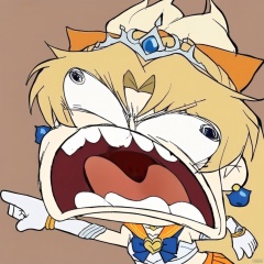 chibi, parody, open mouth, teeth, (masterpiece),(best quality),1girl,sailor venus,masterpiece,best quality,very aesthetic,absurdres,aavenus,long hair,blonde hair,hair bow,tiara,blue eyes,earrings,orange choker,collarbone,orange sailor collar,blue bowtie,white shirt,white leotard,elbow gloves,white gloves,pleated skirt,orange skirt,heart hands,traditional media,