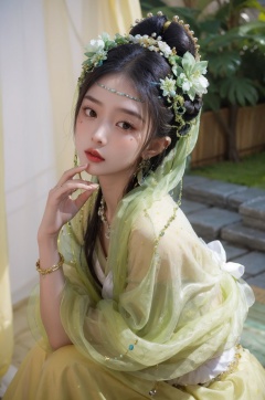 masterpiece,best quality,ultra-detailed,1girl,jewelry,hair ornament,solo,beads,dress,ring,long sleeves,shawl,chinese clothes,curtains,facial mark,hair flower,earrings,necklace,hair bun,forehead mark,bracelet,<lora:PDLX_小绿花仙:0.55>,outdoors,