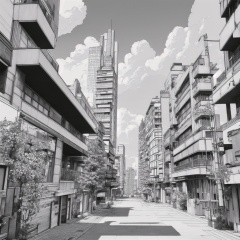jiedao,greyscale,monochrome,scenery,traditional media,outdoors,<lora:素描街道test-0000010:0.8>,scenery,building,street,City center,commercial skyscrapers,bustling streets,(modernist:1.2) design,(blue sky:1.2),daytime,masterpiece,best quality,tree,cloud,, masterpiece, best quality,