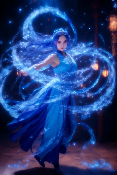 blue-aura,using blue-magic,blue-magic,ancient-costume,dancing,fighting stance,1girl,solo,<lora:magic_fighting_blue_with_reg_4_512_15:0.8>,