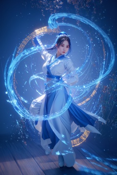 blue-aura,using blue-magic,blue-magic,ancient-costume,dancing,fighting stance,1girl,solo,<lora:magic_fighting_blue_with_reg_4_512_15:0.8>,
