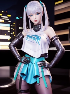 CFwangzheqingyaBW, 1girl, solo, twintails, blue eyes,elbow gloves, thigh boots, looking at viewer, pantyhose, white hair, bangs, dress, belt,bare shoulders, <lora:CFwangzheqingyaBW:0.75>,cityscape, night,