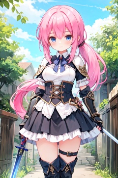 1girl,(pink_hair),crossed bangs,(low ponytail),blue eyes,gothic_lolita,white skirt,gauntlets,one-hand-hilt,hand on hilt,holding sword, planted sword,standing,medieval,