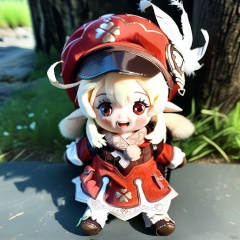 plush-doll-style,masterpiece,best quality,klee, 1girl, klee \(genshin impact\), hat, bag, red eyes, smile, solo, red dress, dress, hat feather, blush, bangs, open mouth, long sleeves, red headwear, backpack, sitting, dodoco \(genshin impact\), outdoors, twintails, blonde hair, looking at viewer, hair between eyes, pointy ears, :d, upper teeth only, feathers, teeth, tree, low twintails, cabbie hat, brown bag, long hair, day, white feathers, sidelocks, eyelashes, object hug, blurry, holding, jumpy dumpty