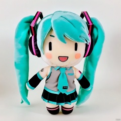 plush-doll-style, plush-doll, hatsune miku, 1girl, solo, grey shirt, necktie, twintails, long hair, skirt, aqua necktie, solid oval eyes, detached sleeves, smile, shirt, white background, sleeveless, sleeveless shirt, aqua hair, black skirt, chibi, black sleeves, open mouth, headphones, bare shoulders, hair ornament, tattoo, looking at viewer, very long hair, shoulder tattoo, simple background, character doll