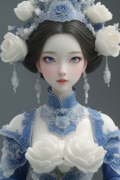 <lora:qinghuaci-000004:0.9>,HDR,UHD,8K,Highly detailed,best quality,masterpiece,qinghuaci,1girl,solo,jewelry,earrings,blue eyes,flower,breasts,looking at viewer,black hair,hair ornament,cleavage,hair flower,hair bun,floral print,white flower,parted lips,upper body,realistic,lips,chinese clothes,double bun,dress,medium breasts,rose,bangs,eyelashes,gradient background,gem,nose,grey background,white rose,gradient,parted bangs,portrait,detached collar,