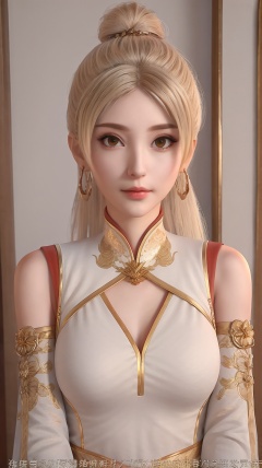 xne,1girl,solo,jewelry,hoop earrings,chinese clothes,blonde hair,mole under eye,mole,long hair,makeup,closed mouth,realistic,Head part out of frame,upper_body,split sleeves and shoulders,clothing cutting,tanono,flower field,sky,