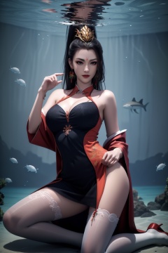 1girl,underwater,submerged,floating hair,air bubble,holding breath,see-through,masterpiece,best quality,highly detailed,fish,(wide hip:1.2),jellyfish,earrings,hair ornament,sea weed,coral reef,shark,sea turtle,sexy pose,kneeling,chinese dress,chinese clothes,large breasts,white laced black pantyhose,cleavage,forehead mark