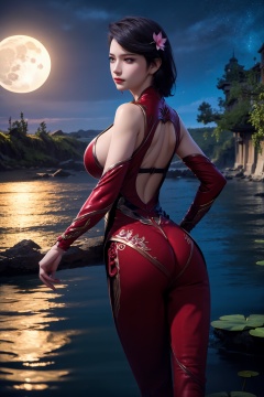 standing,dress,chinese clothes,flower,full_moon,moon,night,lily_pad,lotus,moonlight,nipples,water,night_sky,lily_\(flower\),sky,partially_submerged,1girl,solo,hair ornament,realistic,nail polish,photo_\(medium\),(big breasts,cleavage),makeup,(8k, RAW photo, best quality, masterpiece:1.2),(realistic, photorealistic:1.3),ultra-detailed,extremely detailed cg 8k wallpaper,(crystalstexture skin:1.2),extremely delicate and beautiful,(sexy pose:1.2),ass,from behind,(looking back:1.5),bent over,hair ornament,short hair,