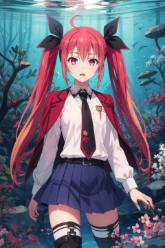 <lora:Kotori-000010:0.8>,Kotori cyql,1girl,looking at viewer,solo,twintails,red hair,ahoge,long hair,ribbon,hair ribbon,red eyes,school uniform,white shirt,jacket on shoulders,necktie,skirt,thighhighs,boots,thigh boots,Confused, Wide-open eyes, a slightly furrowed brow, and a slightly open mouth.,cowboy_shot,beautiful face,beautiful eyes,glossy skin,shiny skin,Coral, Reef, Fish, Seaweed, Colorful, Underwater, Diversity, Serenity,(Rose bushes, Spring blooms, Garden sanctuary, Fragrant air, English countryside, Springtime charm:0.6),beautiful detailed sky,beautiful detailed glow,posing in front of a colorful and dynamic background,masterpiece,best quality,beautiful and aesthetic,contrapposto,female focus,wallpaper,fashion,
