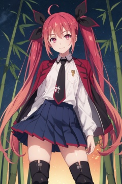 <lora:Kotori-000010:0.8>,Kotori cyql,1girl,looking at viewer,solo,twintails,red hair,ahoge,long hair,ribbon,hair ribbon,red eyes,school uniform,white shirt,jacket on shoulders,necktie,skirt,thighhighs,boots,thigh boots,Flirty, A playful smile, arched eyebrows, and a slightly tilted head.,panorama,beautiful face,beautiful eyes,glossy skin,shiny skin,Bamboo, Grove, Breeze, Peaceful, Tranquility, Nature, Serenity, Zen,(Maple trees, Pumpkin patches, Fall foliage, Crisp air, Harvest time, New England landscape:0.6),beautiful detailed sky,beautiful detailed glow,posing in front of a colorful and dynamic background,masterpiece,best quality,beautiful and aesthetic,contrapposto,female focus,wallpaper,fashion,