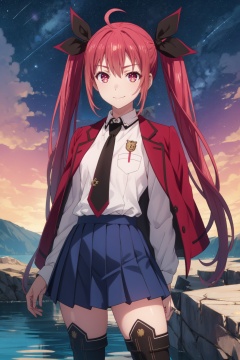 <lora:Kotori-000010:0.8>,Kotori cyql,1girl,looking at viewer,solo,twintails,red hair,ahoge,long hair,ribbon,hair ribbon,red eyes,school uniform,white shirt,jacket on shoulders,necktie,skirt,thighhighs,boots,thigh boots,Teasing, A playful smirk, a raised eyebrow, and a hint of dominance.,upper_body,beautiful face,beautiful eyes,glossy skin,shiny skin,Crater, Lake, Volcano, Water, Reflection, Steam, Rocks, Serenity,(Desert wildflowers, Arid landscape, Desert bloom, Refreshed desert, Floral explosion, Desert oasis:0.6),beautiful detailed sky,beautiful detailed glow,posing in front of a colorful and dynamic background,masterpiece,best quality,beautiful and aesthetic,contrapposto,female focus,wallpaper,fashion,