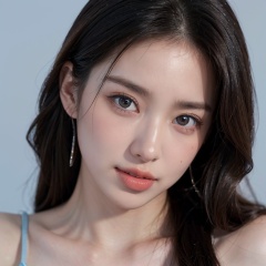 front angle,(8k, best quality, masterpiece:1.2),(realistic, photo-realistic:1.37),ultra-detailed,(looking_at_viewer:1.4),(eye-contact:1.4),1girl, solo, looking_at_viewer, realistic, blue_background, teeth, lips, long_hair, upper_body, open_mouth, ****_top, <lora:YG初恋女神小姐姐:0.7>,