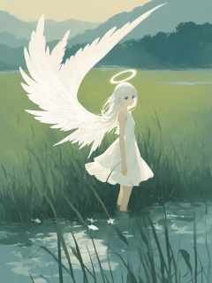 tianliang duohe fangdongye,[ciloranko:0.7],1girl, angel, angel wings, blue eyes, dress, expressionless, fish, grass, halo, long hair, looking at viewer, painting \(medium\), solo, surreal, tall grass, traditional media, water, watercolor \(medium\), white dress, white hair, wings