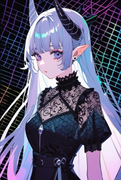 ciloranko,pale demon girl , prismatic coloring, holographic vibe, chromatic black lace blouse, gothic background, (long straight horns:1.2)