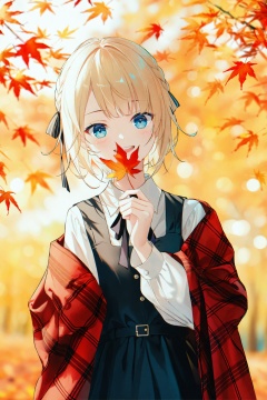 masterpiece,best quality,high quality,(colorful),[Artist toosaka asagi],[[[Artist wlop]]],[Artist chen bin],[Artist omone hokoma agm],Artist hiten (hitenkei),1girl,solo,maple leaf,holding,shirt,holding leaf,white shirt,blurry,autumn leaves,smile,long sleeves,looking at viewer,leaf,hair ribbon,ribbon,sleeveless,open mouth,depth of field,sleeveless dress,braid,dress,hair ornament,outdoors,upper body,shawl,:d,black dress,blurry background,ribbon braid,plaid,blush,scarf,black ribbon,blurry foreground,pinafore dress,blue eyes,autumn,blonde hair,fringe trim,teeth,