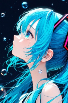 (masterpiece),(best quality),illustration,ultra detailed,hdr,Depth of field,(colorful),nai3 Style,1girl,solo,hatsune miku,long hair,twintails,tears,from side,profile,crying,bare shoulders,aqua eyes,bubble,portrait,blue hair,hair ornament,crying with eyes open,blurry,blue eyes,aqua hair,hair between eyes,water drop,closed mouth,sleeveless,upper body,