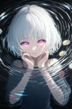 (masterpiece),(best quality),illustration,ultra detailed,hdr,Depth of field,(colorful),(chromatic aberration),(beautiful young female:1.4),(streaming tears),sad,(daisy),(daisy),(daisy),looking at viewer,partially submerged,both hands on own cheek,{see-through long shirt},{no bra},(white hair, short hair, bangs:1.2),(glowing eyes),ripples,dark water,black background,(prismatic),