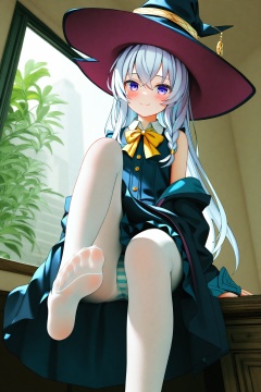 masterpiece,best quality,illustration,ultra detailed,hdr,Depth of field,(colorful),[iumu],[Artist chen bin],nai3 Style,elaina (majo no tabitabi),1girl,feet,pantyhose,striped clothes,solo,striped panties,underwear,panties,toes,soles,hat,long hair,purple eyes,looking at viewer,witch hat,no shoes,shirt,smile,white pantyhose,legs,blush,skirt,white shirt,foot focus,bow,sitting,frilled skirt,black headwear,yellow bow,panties under pantyhose,frills,braid,white hair,yellow bowtie,robe,indoors,black robe,collared shirt,closed mouth,hair between eyes,black skirt,bowtie,plant,grey hair,foot out of frame,window,presenting foot,knee up,sleeveless,