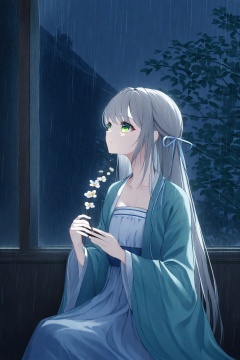 hanfu,1girl,solo,green eyes,chinese clothes,rain,flower,window,night,wide sleeves,ribbon,long sleeves,grey hair,long hair,hair ribbon,indoors,branch,collarbone,looking up,holding,sitting,closed mouth,