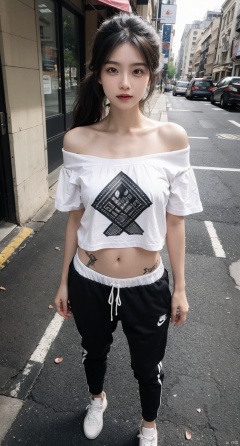 Logical, 14 years old girl,The golden ratio body,asian,White off-the-shoulder T-shirt,medium breasts,tattoo,city,perspective,high ponytail,1girl,xxs, Straighten your legs,Steps,hand remove shirt, Add details,full body photo ,outdoor,tattoos blackwork,moyou,walking, pink sneakers ,Hyperrealism,track pants,Nike,one hand rub head the other touch stomach,