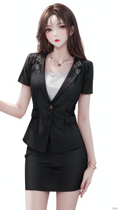 1girl, solo, long hair, looking at viewer, skirt, simple background, brown hair, black hair, white background, jewelry, short sleeves, cowboy shot, earrings, black skirt, necklace, bracelet, formal, pencil skirt, red lips——Clear hand contour,Hand intact,Five fingers of the hand are clear, loli, ((poakl))<lora:EMS-93-EMS:0.800000>, <lora:EMS-254762-EMS:0.500000>, <lora:EMS-346315-EMS:0.800000>
