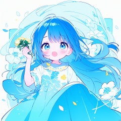 ((artist:nano))blue theme,Tie dyeing,A girl holding a dandelion flower, wearing a blue dress with white dots and yellow flowers on it, blowing away small petals in the style of light skyblue and pale aquamarine illustrations, a simple line drawing reminiscent of children's book illustrations and storybook art, with colorful cartooning and playful character design