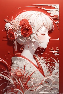 1girl, solo, hair ornament, closed eyes, upper body, flower, red hair, japanese clothes, hair flower, kimono, lips, profile, red background, red theme,fdjz
