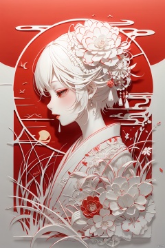 1girl, solo, short hair, bangs, hair ornament, red eyes, jewelry, closed eyes, upper body, flower, white hair, earrings, japanese clothes, hair flower, kimono, eyelashes, profile, makeup, bird, moon, white flower, spot color, red lips, red theme,fdjz