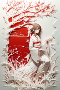 1girl, solo, long hair, brown hair, ribbon, sitting, flower, japanese clothes, wide sleeves, kimono, tree, sash, branch,fdjz