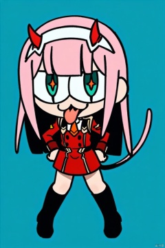neco-arc, chibi, :3, tail,full body,(masterpiece),(best quality),1girl, aqua_background, aqua_eyes, blue_background, buttons, double-breasted, fangs, green_eyes, hairband, horns, long_hair, looking_at_viewer, military, military_uniform, necktie, pink_hair, sky, solo, tongue, tongue_out, uniform, white_hairband, zero_two_\(darling_in_the_franxx\)
