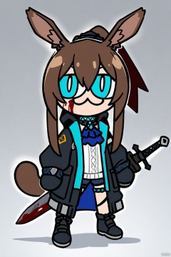 neco-arc, chibi, :3, tail,full body,(masterpiece),(best quality),1girl, animal ears, amiya (arknights), solo, blue eyes, rabbit ears, long hair, holding, looking at viewer, blood, weapon, blue ascot, upper body, holding weapon, brown hair, ascot, hair between eyes, sword, holding sword, jacket, blood on face, closed mouth, open clothes, sidelocks, open jacket, jewelry, shirt, neck ring, white shirt, black jacket, ponytail, glowing,