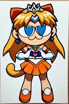 neco-arc, chibi, :3, tail, full body,(masterpiece),(best quality),1girl,sailor venus,masterpiece,best quality,very aesthetic,absurdres,aavenus,long hair,blonde hair,hair bow,tiara,blue eyes,earrings,orange choker,collarbone,orange sailor collar,blue bowtie,white shirt,white leotard,elbow gloves,white gloves,pleated skirt,orange skirt,heart hands,traditional media,