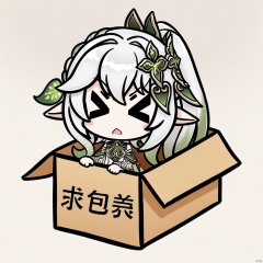 chibi, in-box, > <, open mouth,(masterpiece),(best quality),solo, 1girl,flower, hair ornament,looking at viewer, open mouth, elf girl,pointy_ears,small breast, :), white hair,green hair,green eyes,symbol-shaped pupils, bangs, breasts,cross-shaped pupils, hair ornament, gradient hair,bare foot, black cat near foot,nahida (genshin impact),chibi_in-box_> <